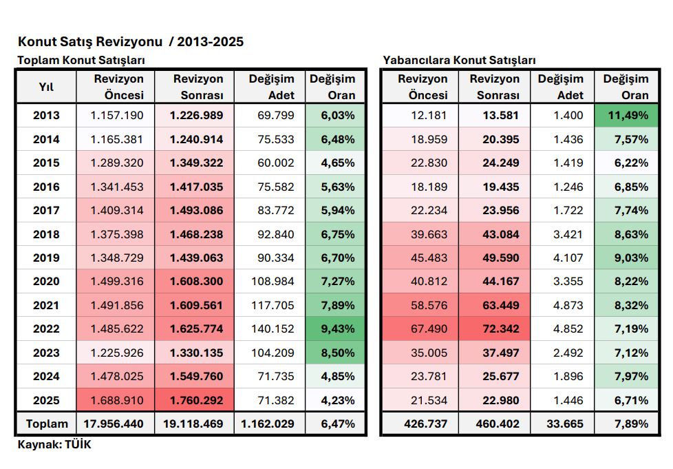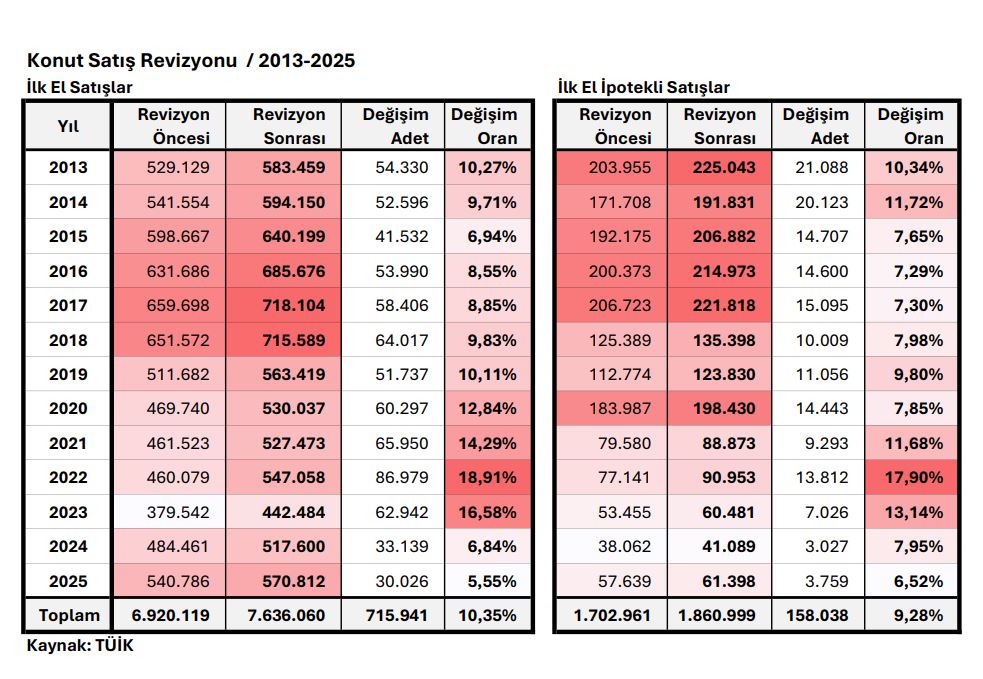 2013 – 2025 yılları arasındailk el konut satışlarında gerçekleşen revizyon adet toplamı 715.941 adettir. Endüşük yıllık düzeltme 2025 yılında % ,055 ile toplam 30.026 adet olarakgerçekleşirken; en yüksek yıllık %18,91 ile 86.979 adetlik düzeltme ile 2022yılıdır.