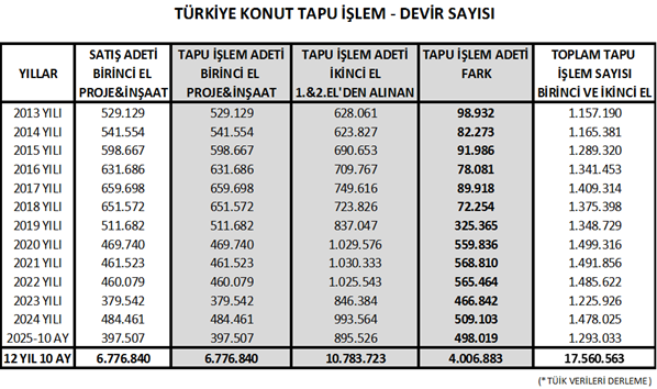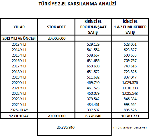 Göreceğiniz üzere26.776.840’ dan 2013-2025 Ekim sürecinde 2.el’de 10.783.723 adeti konut el değiştirmiştir.
