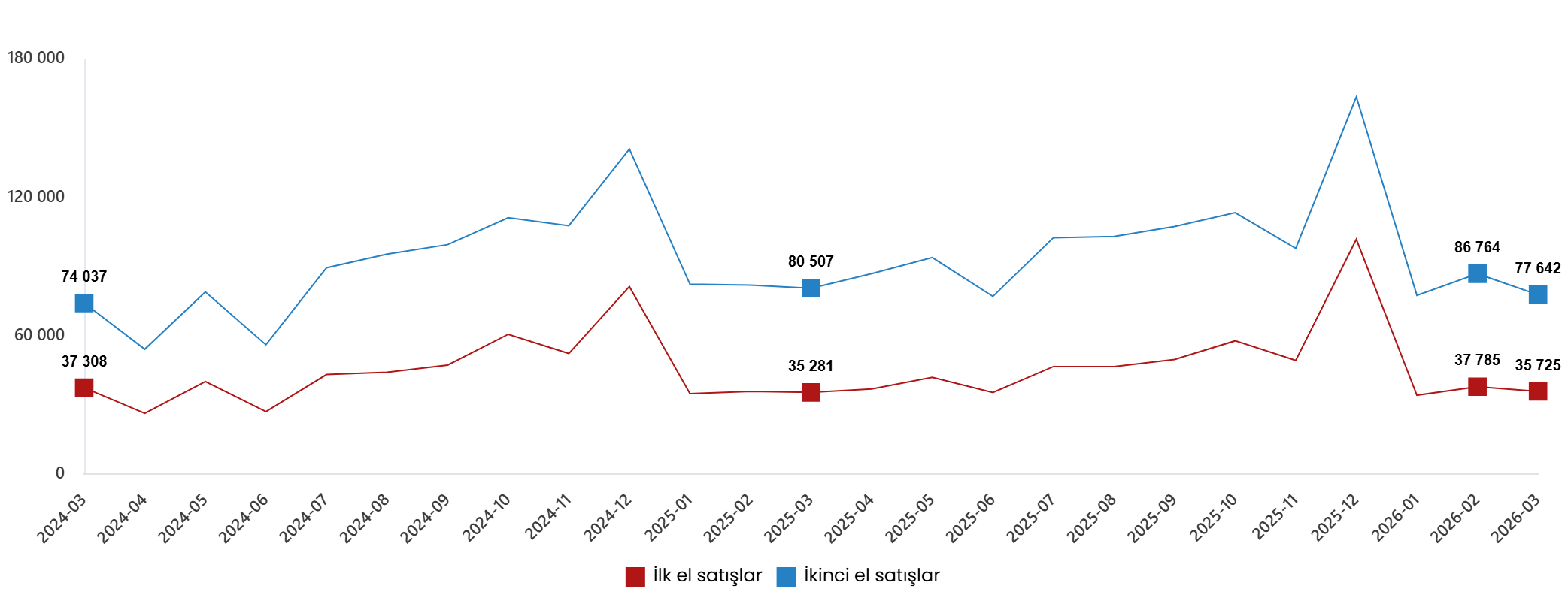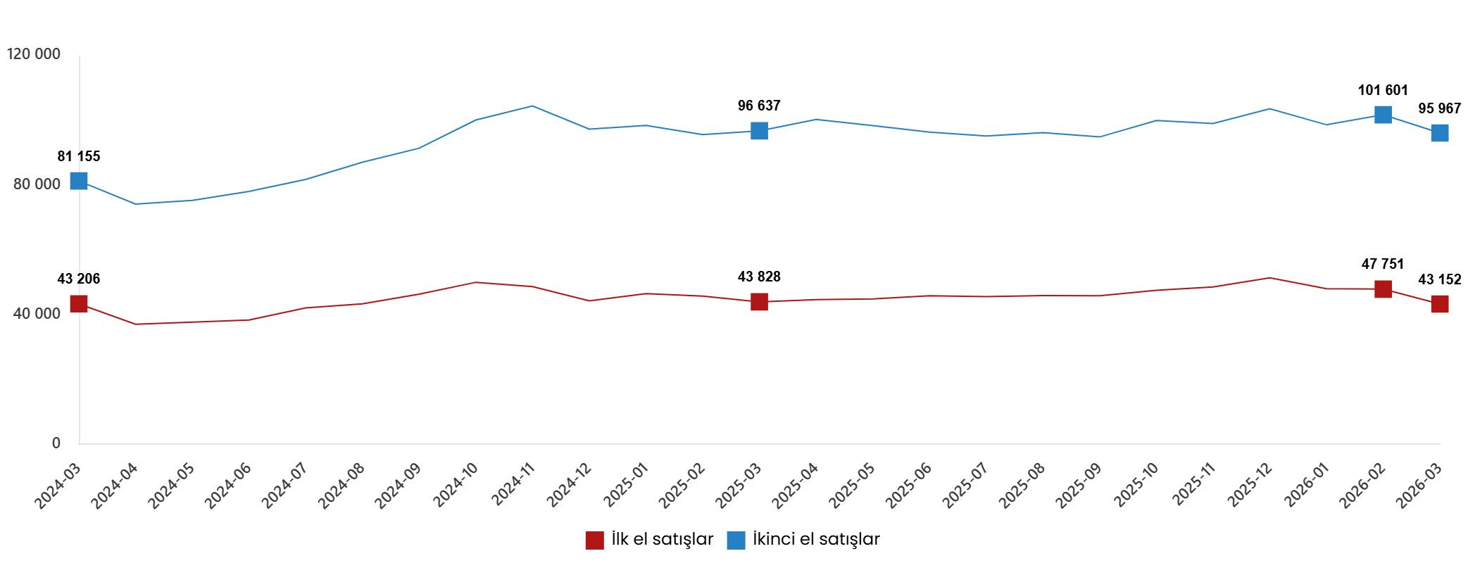Türkiye genelinde ilk el konut satış sayısı Mart ayında bir önceki yılın aynı ayına göre %1,3 oranında artarak 35 bin 725 oldu. İkinci el konut satışları ise Mart ayında bir önceki yılın aynı ayına göre %3,6 oranında azalarak 77 bin 642 oldu. Toplam konut satışları içinde ilk el konut satışlarının payı %31,5, ikinci el konut satışlarının payı %68,5 oldu.