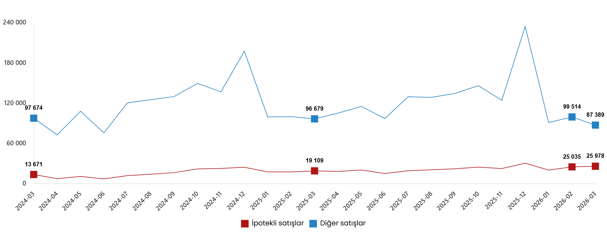 Türkiye genelinde ipotekli konut satışları Mart ayında bir önceki yılın aynı ayına göre %35,9 oranında artarak 25 bin 978 oldu. Diğer konut satışları ise Mart ayında bir önceki yılın aynı ayına göre %9,6 oranında azalarak 87 bin 389 oldu. Toplam konut satışları içinde ipotekli satışların payı %22,9 diğer satışların payı %77,1 olarak gerçekleşti.