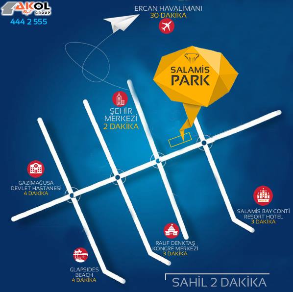 Yeniboğaziçi’nin “Yeni yaşam merkezi” olan Salamis Park’ın muhteşem konumu ile Deniz’e 2 dakika, Glapsides Beach’e 4 dakika, Gazimağusa Devlet Hastenesi’ne 4 dakika, Rauf Denktaş Kongre Merkezi 3 dakika, Salamis Bay Conti Hotel’e 3 dakika, Lefkoşa Ercan Havalimanı’na ise sadece 30 dakikalık uzaklık ile heryere adım mesafedesiniz…